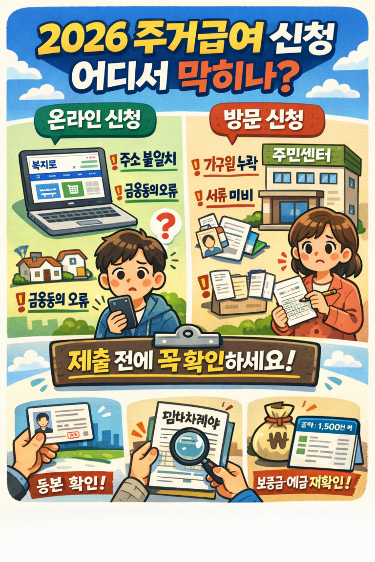 2026 주거급여 신청방법을 온라인·오프라인 기준으로 정리했습니다. 신청 조건 충족해도 서류 오류·가구원 계산 실수로 반려되는 사례가 많습니다. 접수 전 반드시 확인하세요. 도입부 요약 주거급여는 기초생활보장 수급 가능 가구라면 신청 자체는 어렵지 않습니다.하지만 실제로는 가구원 계산과 임대차계약서 불일치 때문에 접수 단계에서 반려되는…